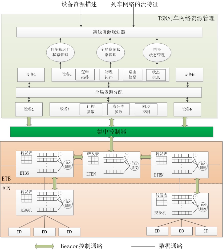 TSN與ETB、ECN結合主要是通過將TSN的時間同步、802.1Qch的周期性調度算法以及令牌桶的算法與當前以太列車ETB、ECN技術相融合,通過集中控制方式在列車初運行完成后對列車網絡中的各ETBN以及ECN交換節點進行集中管理控制以及統一的資源規劃管理,以實現對列車通信網絡中各業務流的精確控制以及確定轉發的功能。