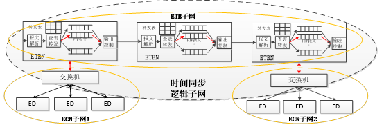 圖2所示,在以太列車網絡中,ETB的骨干網絡為一個獨立的子網,各ECN網絡也為一個獨立的子網。通過報文解析模塊以及輸出調度模塊的控制,可以使的ETB子網與ECN子網1以及ECN子網2成為一個虛擬的時間同步的邏輯子網,并實現不同子網間的時間同步功能。