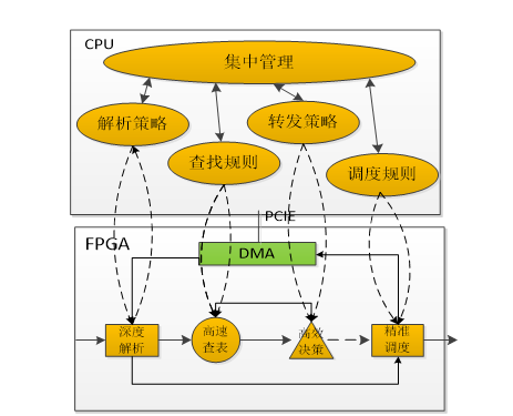 這些功能可以通過將一些確定處理規則通過硬件實現,來緩解軟件處理以及軟件與硬件數據通路的壓力,使得部分通用功能基于硬件處理控制,而復雜的任務在交由軟件處理,從而緩解系統的處理負載以及提高系統的處理效率,實現結構如圖2所示。
