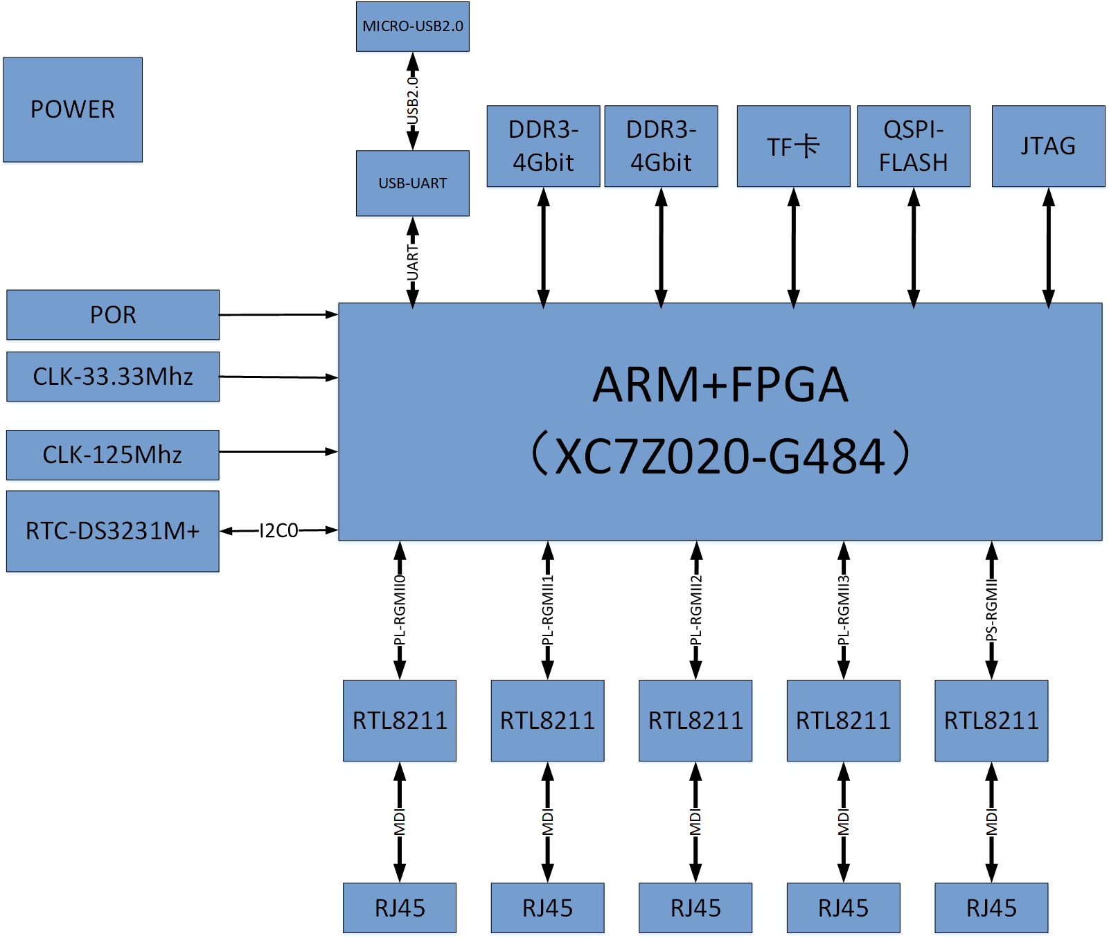 采用Zynq Soc芯片,內部封裝了雙核Arm CPU以及Xilinx FPGA,雙方通過AXI總線互聯,由于內部的高集成度以及較高的總線帶寬,