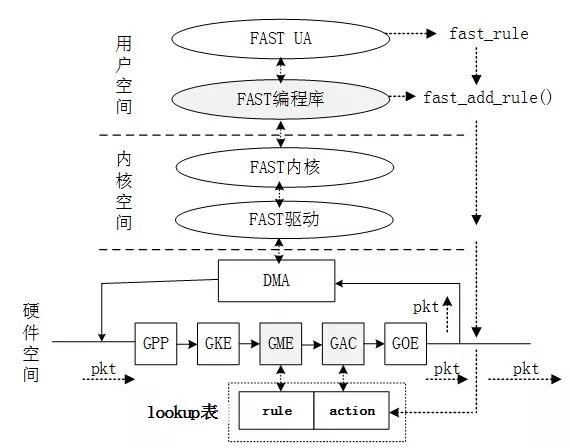 以增加規則為例,UA首先按照FlowMod消息中包含的規則和動作信息,構造fast_rule結構體,然后調用FAST編程庫中所提供的fast_rule_add()將fast_rule結構體攜帶的流表配置信息經FAST內核和FAST驅動,寫入硬件GME模塊和硬件GAC模塊所關聯的lookup表中。