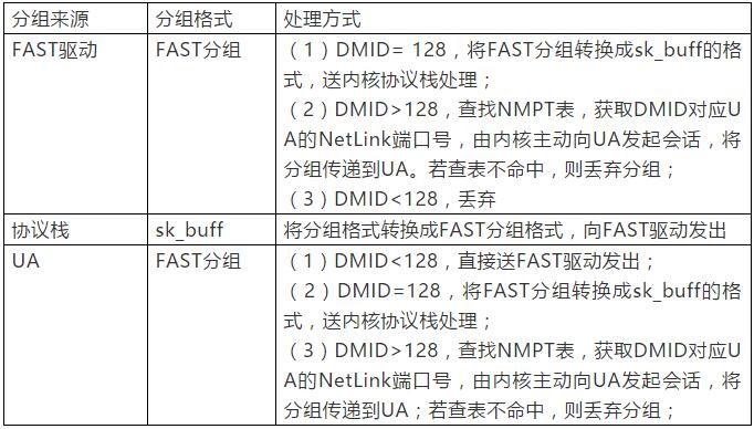 因此FAST內核根據FAST分組的DMID實現了FAST流水線,多個FAST UA以及協議棧之間的分組交換。從協議棧角度看,FAST內核是一個特殊的網絡接口,在內核中的地位與標準的網絡接口驅動基本一致。由于協議棧發出的分組無分組的輸出接口信息,該分組進入FAST流水線后需要通過正常的轉發獲取輸出接口的信息。