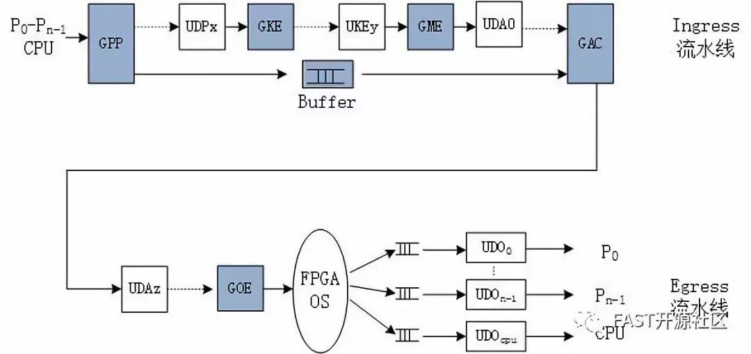 FAST基本流水線包含通用分組解析(GPP)、通用關(guān)鍵字提取(GKE)、通用匹配引擎(GME)、通用轉(zhuǎn)發(fā)動(dòng)作(GAC)和通用輸出引擎(GOE)五個(gè)模塊。基于這五個(gè)模塊搭建的基本架構(gòu),F(xiàn)AST流水線支持動(dòng)態(tài)模塊的插入和刪除,如下圖所示。