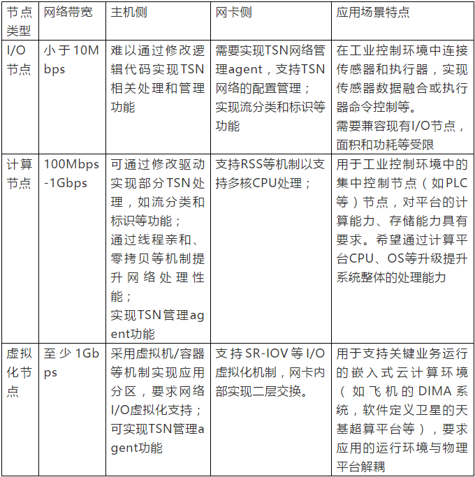 每種TSN端系統的比較如下表所示。由于不同端節點具有不同的特點,在主機測和網卡側的TSN功能劃分差異較大,因此難以實現通用的TSN網卡設計。