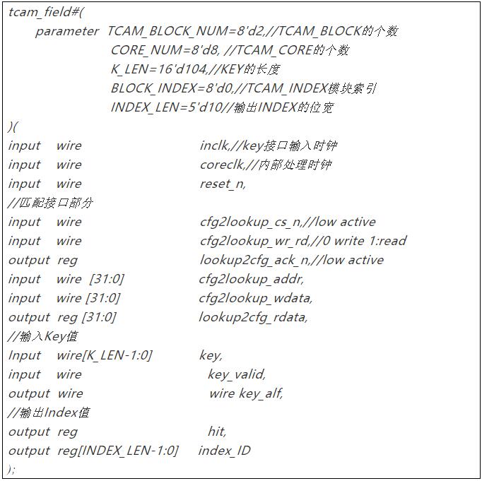 以下為XS-TCAM-104x320的頂層代碼其主要分為四部分:時鐘復位接口、規則配置接口、匹配關鍵字Key輸入接口以及規則輸出索引號Index_ID具體如下圖5所示,其Quartus II 中代碼結構如圖6所示,代碼文件如表1所示。