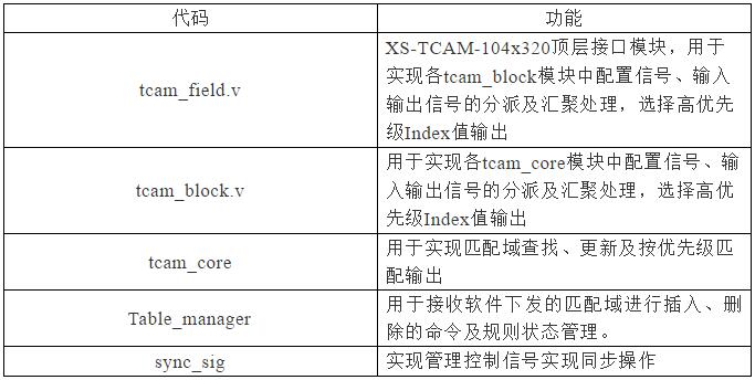 XS-TCAM-104x320的代碼文件說明如表1所示: