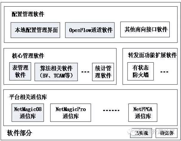 核心管理軟件主要是SDN交換機數據平面中由CPU軟件實現的基本功能,包括各種表管理軟件,硬件相關的驅動和管理軟件以及軟硬件協同處理中的軟件功能實現部分。各部分主要功能如下。