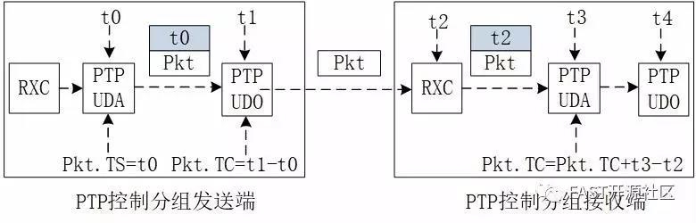 FAST-TSN-04需要發(fā)送PTP分組時(shí), PTP-UDA產(chǎn)生PTP分組,并將分組從PTP-UDA離開的時(shí)間t0填寫到分組的元數(shù)據(jù)中,假設(shè)該分組到達(dá)PTP-UDO時(shí)間為t1,則該分組在交換機(jī)內(nèi)部的延時(shí)將會(huì)填寫到分組的透明時(shí)鐘域TC中,隨分組從網(wǎng)絡(luò)接口發(fā)出。