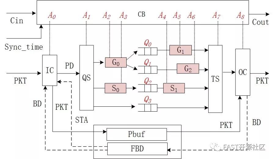 CQF是目前TSN標準定義的可實現確定性交換延時的轉發模型,其交換流程可以方便的映射到FAST平臺的FPGA流水線上。FAST流水線的用戶定義輸出(UDO)模塊可實現用戶定義的分組輸出控制,支持TSN CQF轉發模型的UDO稱為CQF-UDO。